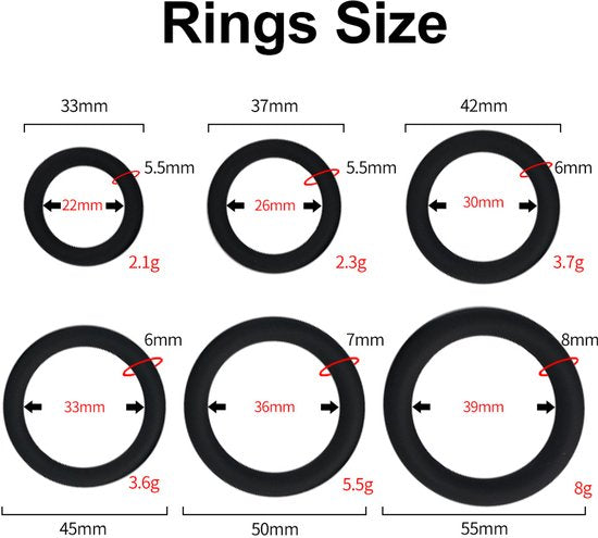Lusties Cockring Set: Ontdek Jouw Perfecte Maat en Maximale Kracht Haal het maximale uit je intieme momenten met de veelzijdige Lusties 6-delige Cockring Set. Of je nu op zoek bent naar een hardere erectie, het uitstellen van de ejaculatie of simpelweg meer intensiteit in de slaapkamer wilt ervaren; deze set biedt de ideale oplossing voor iedere man. Dankzij de zes verschillende maten kun je veilig experimenteren en ontdekken welke ring voor jou het meest comfortabel en effectief is. Waarom kiezen voor de Lusties Cockring Set? Veel cockringen zijn ‘one size fits all’, maar elk lichaam is anders. Deze set bevat 6 ringen in oplopende maten (van 22 mm tot 39 mm binnendiameter). Hierdoor kun je niet alleen de juiste maat voor de basis van de penis vinden, maar ook experimenteren met 'stacking' (het dragen van meerdere ringen tegelijkertijd) voor een extra krachtig effect en een indrukwekkend visueel resultaat. Jouw Voordelen op een Rij: • Hardere & Langere Erectie: Door de bloedsomloop licht te beperken, blijft het bloed langer in de penis aanwezig. Dit resulteert in een stevigere erectie en helpt bij het uitstellen van het hoogtepunt. • Optimale Pasvorm: Met 6 verschillende maten vind je altijd de ring die precies strak genoeg zit zonder te knellen. • Hoogwaardig Medisch Siliconen: Gemaakt van zijdezacht, geurloos en hypoallergeen siliconen. Het materiaal is lichaamsveilig en voelt natuurlijk aan. • Superieure Elasticiteit: De ringen zijn extreem rekbaar, waardoor ze eenvoudig aan te brengen zijn en altijd hun vorm behouden. • Discreet & Stijlvol: De set wordt geleverd in een combinatie van klassiek zwart en uitdagend rood. Specificaties & Maten De set bevat 6 ringen met de volgende binnendiameters: • Zwart: 22 mm / 26 mm / 30 mm • Rood: 33 mm / 36 mm / 39 mm Gebruikstip: Gebruik de ringen altijd in combinatie met een glijmiddel op waterbasis voor optimaal comfort. Draag de ringen niet langer dan 30 minuten per keer om de bloeddoorstroming gezond te houden